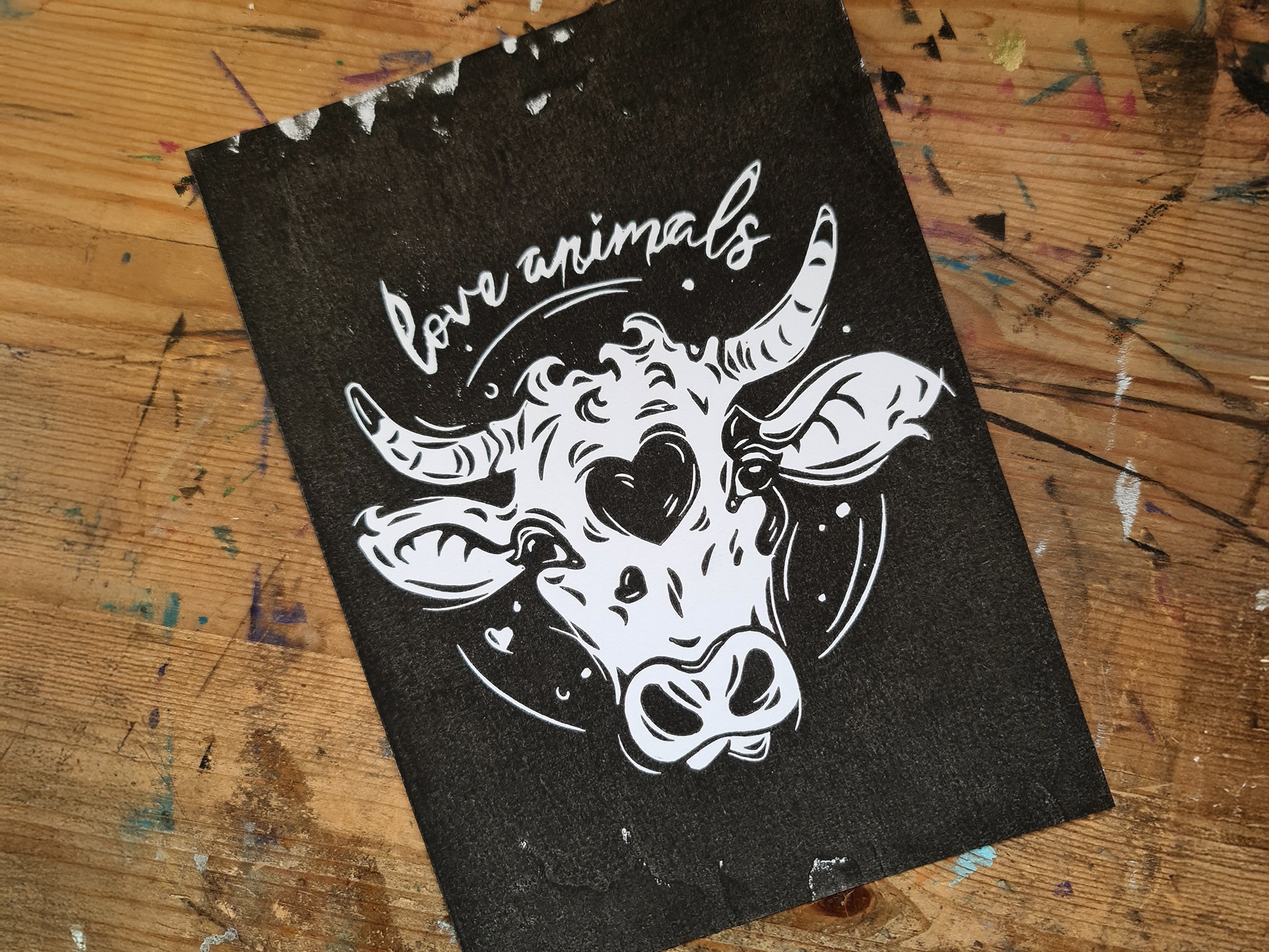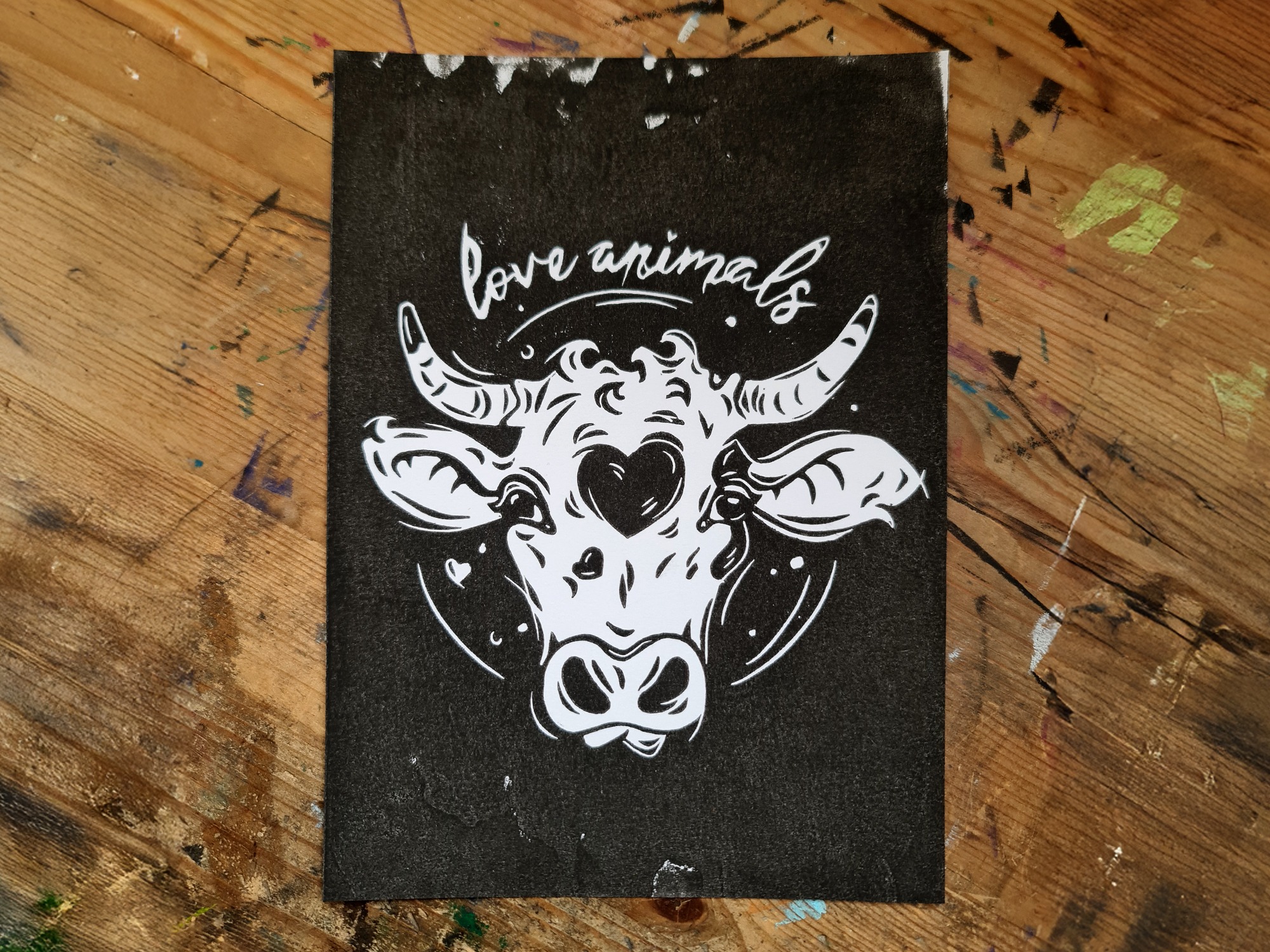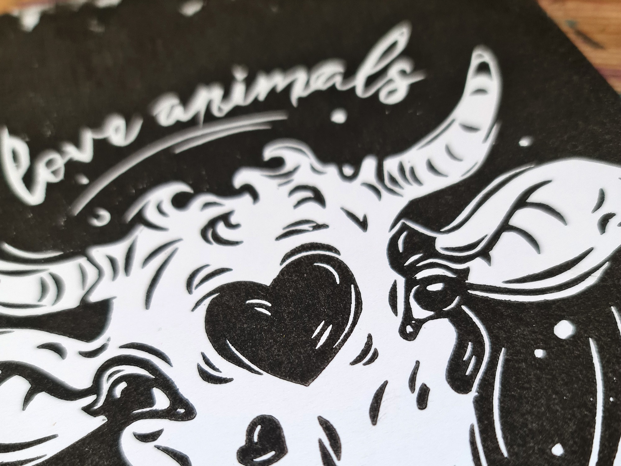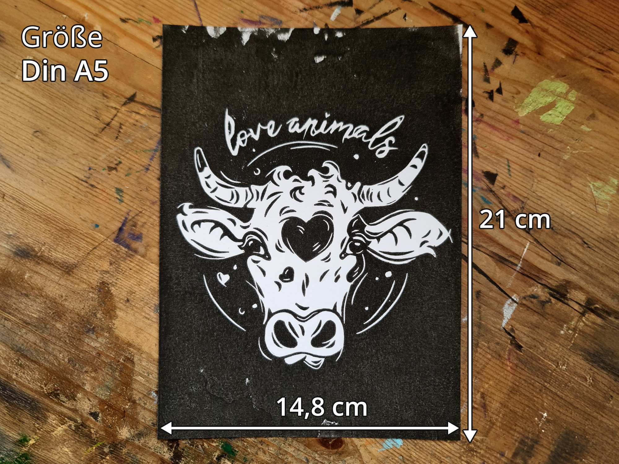 Der Linoldruck mit der Kuh mit einem Herz auf der Stirn und dem Schriftzug love animals steht für Mitgefühl, Achtsamkeit und den respektvollen Umgang mit Tieren. Durch den kräftigen Schwarz-Weiß-Kontrast wirkt die Illustration klar und eindrucksvoll, bleibt dabei aber sanft im Ausdruck. Der Druck ist handgemacht und nachhaltig produziert – ein besonderes Wandbild für alle, die mit Tierliebe ein Statement an ihrer Wand setzen möchten.