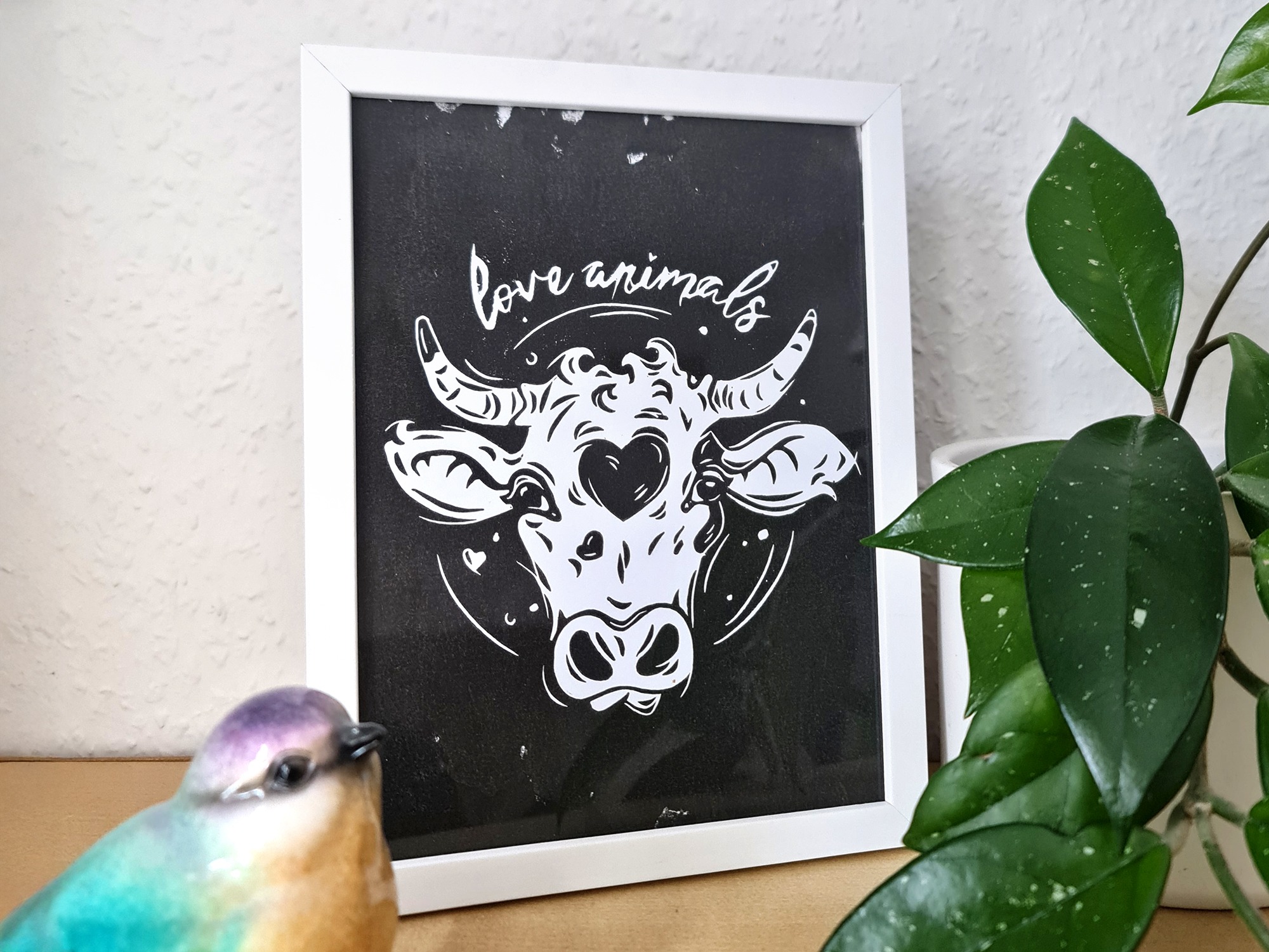 Dieser Druck ist ein schönes Geschenk für Menschen, die Tiere lieben oder vegan leben. Er passt zu allen, die bewusst konsumieren und Handgemachtes schätzen. Ob als kleines Kunstwerk für die Küche oder das Wohnzimmer – das Motiv erinnert jeden Tag daran, was wirklich zählt: Mitgefühl und Wertschätzung gegenüber Tieren. Ein ehrliches, nachhaltiges Geschenk mit Bedeutung.
