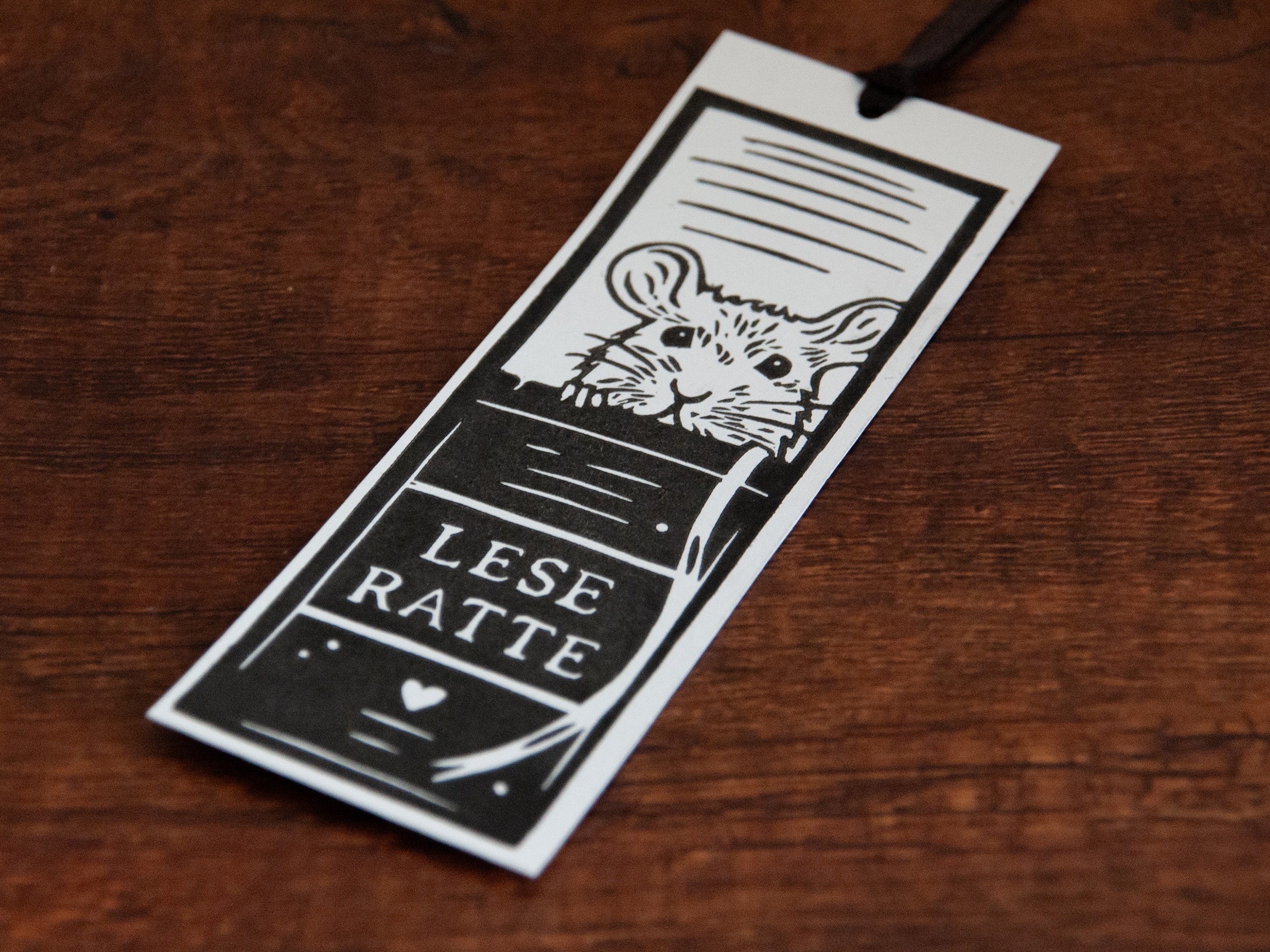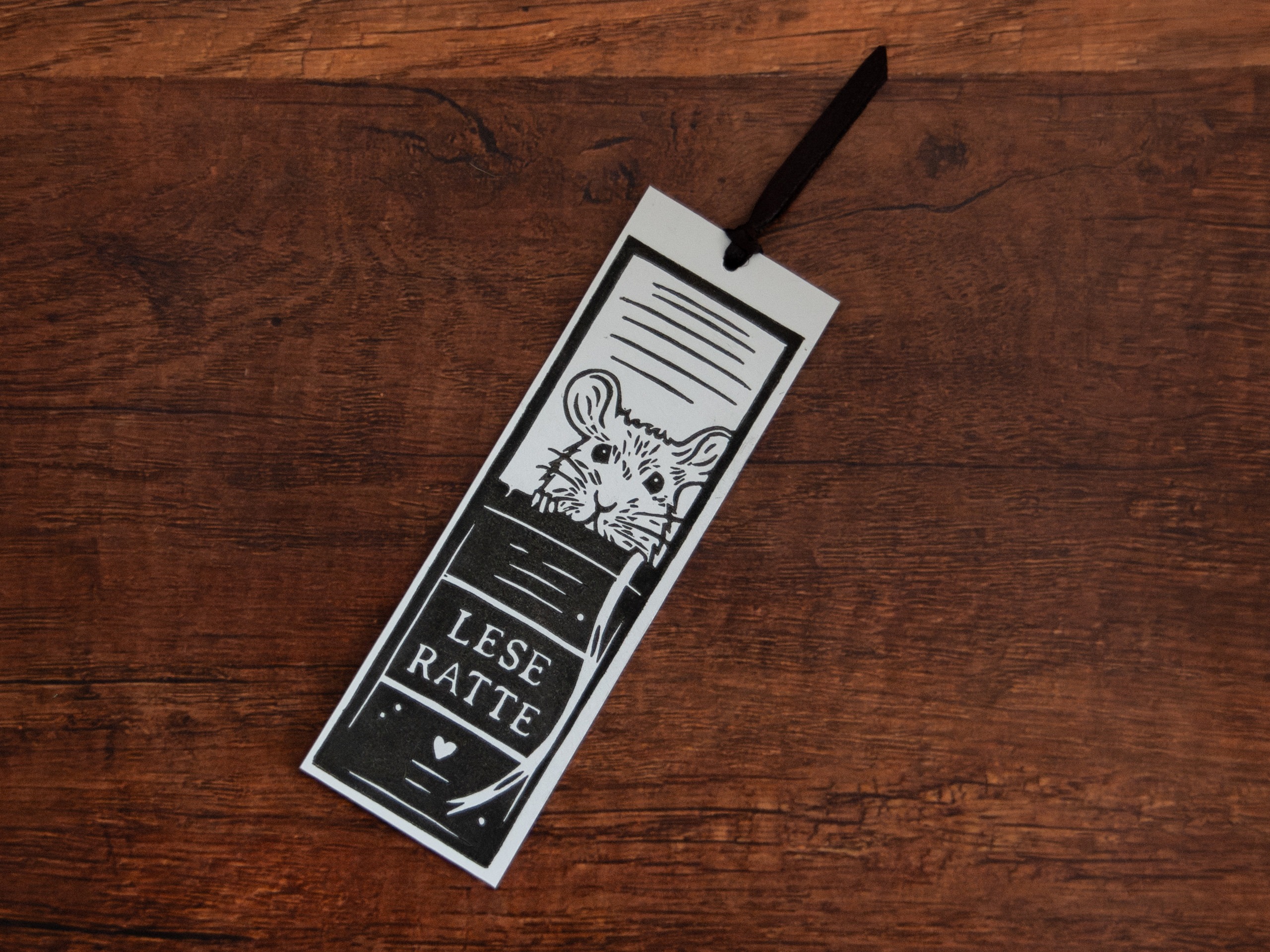 Dieses handgemachte Lesezeichen ist eine kleine Liebeserklärung an alle Leseratten – wortwörtlich. Die süße weiße Ratte schaut neugierig über den Buchrücken, auf dem der Schriftzug „Leseratte“ prangt. Das Motiv wurde per Hand im Linoldruckverfahren auf weißem Papier gedruckt – ganz klassisch in schwarzer Farbe, mit starkem Kontrast und klaren Linien. Die Darstellung ist zugleich charmant, augenzwinkernd und minimalistisch. Ein ideales Geschenk für Bücherfreundinnen, Rattenliebhaberinnen oder Menschen mit Sinn für Humor und Detail.
