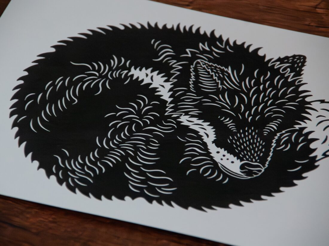 Dieser Linoldruck zeigt einen schlafenden Fuchs – friedlich zusammengerollt, ganz in sich ruhend. Die Darstellung vermittelt Stille, Geborgenheit und Rückzug – ein Motiv, das unaufdringlich wirkt und dennoch Präsenz zeigt. Die Ausführung in Schwarz-Weiß wirkt besonders klar, reduziert und modern. Durch den Verzicht auf Farbe liegt der Fokus ganz auf der Form und Struktur des Fuchses – jedes einzelne Fellbüschel, jede Rundung ist sorgfältig geschnitten und handgedruckt.