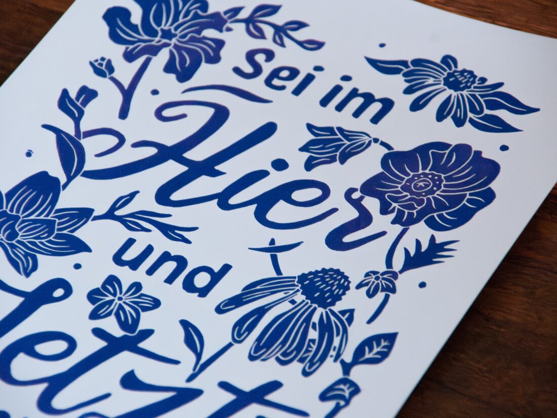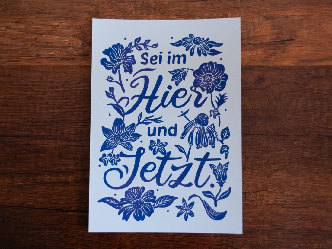 Dieser handgefertigte Linoldruck erinnert in seiner Botschaft und Gestaltung an das, was im hektischen Alltag oft verloren geht: den gegenwärtigen Moment. Der klare Schriftzug „Sei im Hier und Jetzt“ steht im Mittelpunkt und wird von zarten, stilisierten Blättern und Blumen umrankt. Die Komposition ist verspielt, aber nicht überladen – fein gezeichnet, organisch und harmonisch.